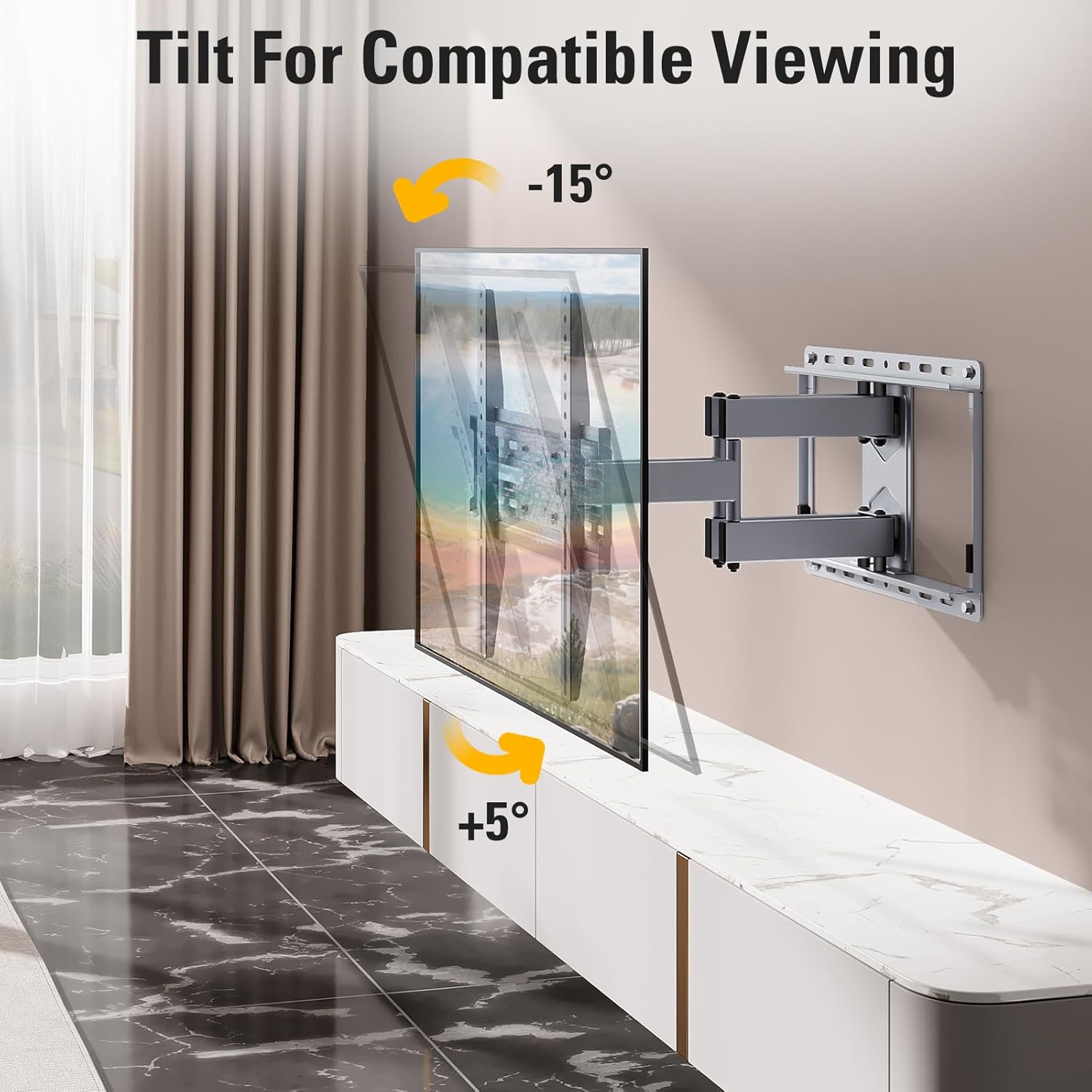 • Enhance Your View: This full motion TV mount tilts TV up 5° and down 15° to reduce glare, and swivels TV left or right 45°according to your seat position. Pull out to 17.5" and retract back to 3.4", making your TV alive to move